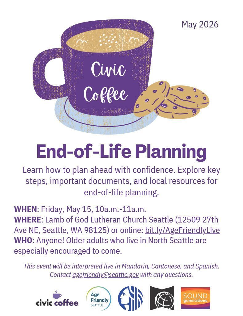 Anyone is welcome to attend! Older adults who live in North Seattle are especially encouraged to come. This event will be interpreted live in Mandarin, Cantonese, and Spanish.